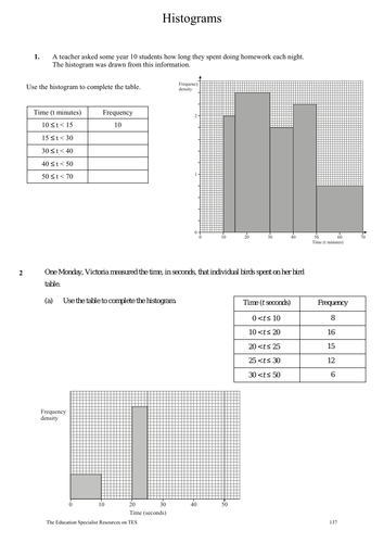 High School Statistics Worksheets - printable math worksheets for ... High school math students can use these statistics problems for study purposes. High School Teachers - you're welcome to copy these worksheets for classroom use. Parents - if you'd like to help your child learn math we suggest you start with our math tutorial section before returning to use these worksheets. Worksheet #2 on Histograms and Box and Whisker Plots.jnt Complete the frequency table below using the data in the frequency histogram shown. 4) The scores on a mathematics test were 70, 55, 61, 80, 85, 72, 65, 40, ...11 pages Histograms Questions | Worksheets and Revision | MME Example 1: Drawing a Histogram Below is a grouped frequency table of the lengths of 71 71 pieces of string. Construct a histogram of the data. [4 marks] To construct a histogram, we will need the frequency density for each class. Dividing the frequency of the first class by its width, we get
